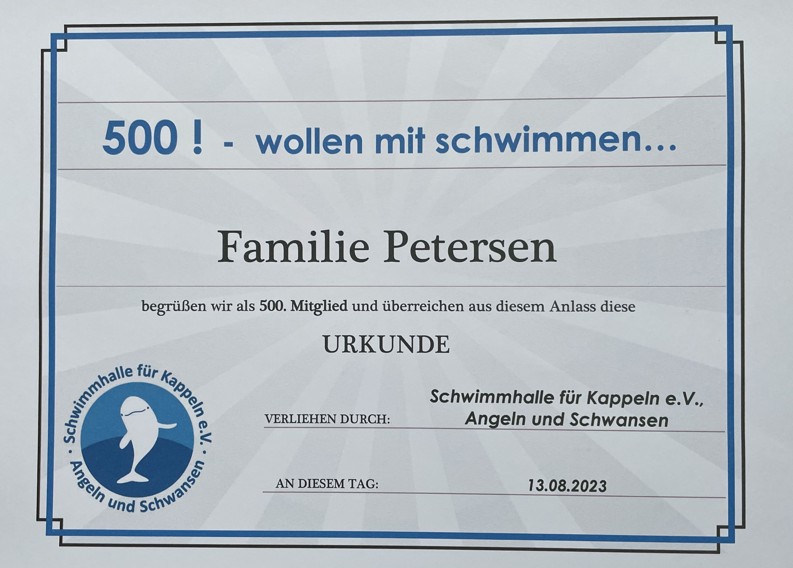 Die Mitgliedszahlen unseres Vereins steigen weiter. Im August 23 konnten wir unser Mitglied mit der Nummer 500 ehren. Der Familienvater Jürgs Petersen aus Olpenitzfeld ist der Glückliche. Er schloss gemeinsam mit seiner Frau Frederike eine Familienmitgliedschaft auf dem Hafenmarkt im Ostsee Ressort Olpenitz ab.